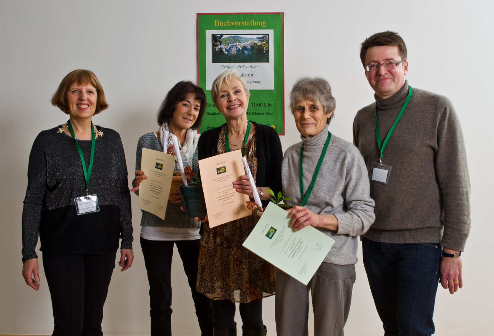 Bei ihrer Begrüßung stellten die Autoren Ilona Hellmann und Gerd Michaelis noch einmal kurz den Entwicklungsprozess dieses umfangreichen, im April gestarteten Projektes vor. Anschließend öffnete Andreas Roll den großen Karton und präsentierte dem Publikum das mit Spannung erwartete erste Buch. Teilnehmer und Gäste äußerten immer wieder Begeisterung darüber, ihren Garten in einem dermaßen schönen, professionell gestalteten Werk wiederzufinden. Dementsprechend rege gestaltete sich auch der Buchabsatz. Bewaffnet mit Buch und Stimmzettel machte man sich nun an die Arbeit, um noch die drei Preisträger des Wettbewerbes zu ermitteln. Diese Aufgabe schien für viele Besucher zunächst schier unlösbar zu sein. Immer wieder blätterten sie ihr Buch von vorn nach hinten und zurück durch, tauschten sich mit ihren Sitznachbarn aus, kosteten die vielen mitgebrachten Plätzchen, um endlich ihre Bewertung zu notieren und in die „Wahlurne“ einzuwerfen. Die Wahlkommission, bestehend aus Thomas Görgen, Ulrich Horalek und Kent Michaelis ließ anschließend verlauten, daß die Auszählung der Stimmzettel komplizierter als bei der Kommunalwahl gewesen sei, doch eine gute Stunde später konnten Ilona Hellmann und Andreas Roll endlich die drei Preisträgerinnen dem Publikum vorstellen und ihnen eine Urkunde, ein Freiexemplar von „Grüner wird’s nicht“ sowie eine Pflanze überreichen.