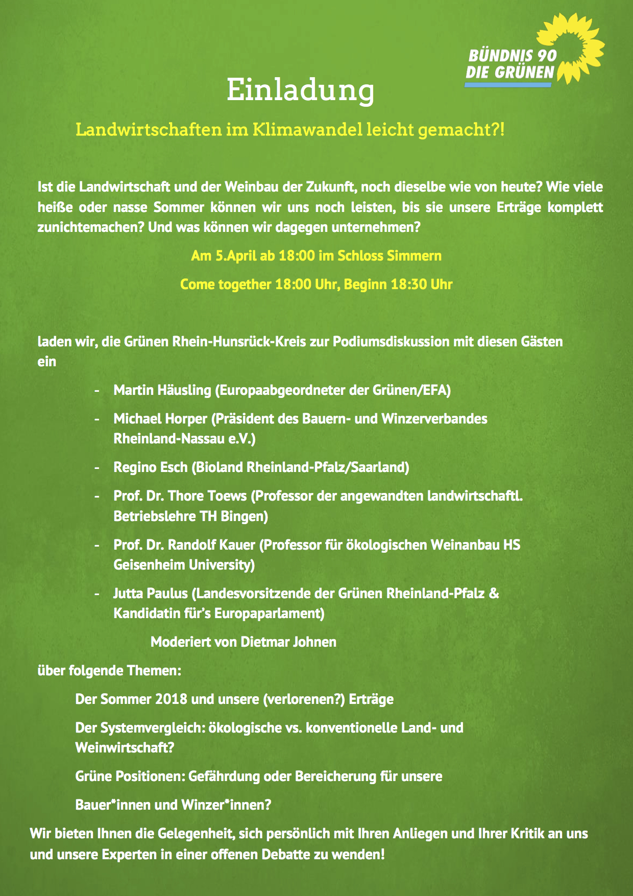 Dabei werden wir nicht nur diesen Sommer ansprechen, sondern auch den Systemvergleich wagen. Dabei wollen wir die Vor- und Nachteile der konventionellen als auch ökologischen Land- und Weinwirtschaft erörtern. Ein weiteres wichtiges Anliegen ist ein selbstkritischer Blick auf unsere grüne Position.