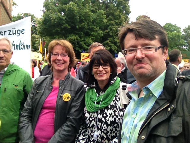 Ca. 1500 Menschen demonstrierten am Samstag, den 10.05. 2014, zum dritten Mal in Rüdesheim gegen den Bahnlärm im Mittelrheintal. Bündnis 90/Die Grünen waren mit zahlreichen Teilnehmern vertreten. Einer der Hauptreder war Tarek Al Wazir, der grüne stellvertetende Regierungschef des Landes Hessen und Minister für Wirtschaft und Verkehr. Aus Rheinland-Pfalz waren unter anderen die Bundestagsabgeordnete Tabea Rössner und die stellvertretende Fraktionsvorsitzende der Grünen im rheinland-pfälzischen Landtag vertreten. Für unseren Stadtverband nahm Andreas Roll an der Demo teil, er vertrat damit auch das Spitzenteam der Kreisgrünen, dem er angehört. Letzteres hatte sich erst kürzlich in Oberwesel über die Lärmproblematik bei Betroffenen informiert. Bahnlärm macht krank, Bahnlärm belastet! Unter diesem Motto forderten die zahlreich vertretenen BIs Maßnahmen zur Reduzierung der Lärmbelastung. Neben erhöhten Trassenpreisen für laute Güterzüge sollen Nachtfahrverbote und Geschwindigkeitsbegrenzungen von 50 Km/h schnell umgesetzt werden. Tarek Al Wazir sieht für das Umrüsten der lauten Güterwagen bei den Waggonbetreibern nur noch ein Zeitfenster bis 2016. Er forderte die Betreiber zum Handeln auf und nicht zu warten, bis die Politik sie zwingt! Danach müssen; und hierfür setzen sich die Landesregierungen von NRW, RLP, Hessen und BaWü ein; diese Schutzmaßnahmen greifen, damit die gesundheitliche Unversehrtheit der Bevölkerung und die wirtschaftliche Entwicklung im Rheintal gewahrt bleiben. „Die BIs und die vielen Menschen im Tal werden weiter protestieren und die Politiker unaufhörlich auffordern, nicht nur zu reden sondern zu handeln“, ist sich Willi Pusch, der Vorsitzende der Bürgerinitiative gegen Bahnlärm im Mittelrheintal e.V., sicher! Die Bopparder- und Kreisgrünen werden ebenfalls nicht lockerlassen, am nächsten Freitag treffen sie sich mit ihrer Umweltministerin wieder in Boppard, um die rechtlichen Möglichkeiten von Geschwindigkeitsbegrenzungen mit Vertetern von BIs und Betroffenen zu erörtern.